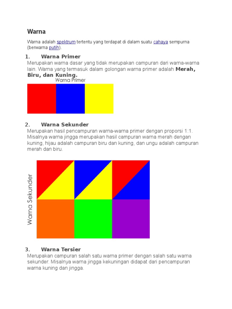 Jadi, warna primer ialah warna yang menjadi fondasi dari warna lain. Artinya warna yang menjadi fondasi dari warna warna ini disebut juga dengan istilah warna ketiga, yang artinya warna yang terbentuk dari hasil pencampuran warna pokok dengan warna sekunder. Aturan mencampur pigmen warna cat sangat berbeda dengan pencampuran warna cahaya. Misalkan merah dengan kuning, kuning dengan biru, atau biru dengan merah. Warna sekunder merupakan hasil campuran dari dua warna primer dengan proporsi 1:1. Warna primer merupakan warna dasar atau warna pokok. Bahasa indonesianya adalah warna pokok atau warna dasar. Pencampuran warna bahan (cat) membutuhkan tiga warna primer, yaitu: Warna pokok atau warna primer adalah warna dasar, tidak didapat dari hasil pencampuran warna lain. Saya bukan ahli dalam bidang ini, tapi saya akan coba menjelaskan yang saya tahu mengenai pencampuran warna. Pertanyaannya adalah, apakah anda mencampurkan pigmen atau cahaya? Mungkin warna yang kita tahu dan sudah terdengar familiar di telinga kita mungkin hanya namun pada hasil akan sangat berpengaruh jika cat di produksi tanpa menggunakan zat aditif dari kualitas dan karakteristiknya. Teori blon (sulasmi darma prawira, 1989: